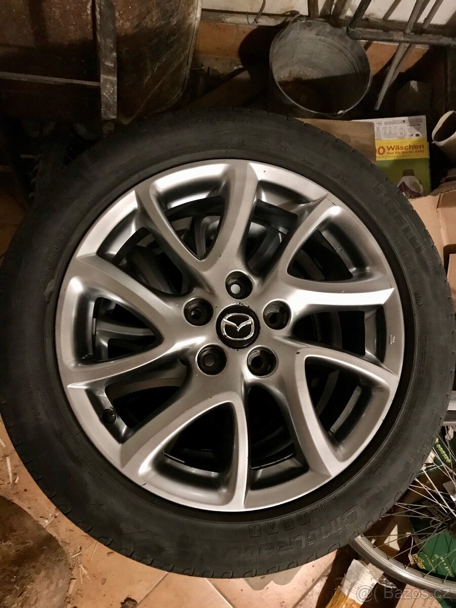 Prodám alu kola originál Mazda 225/45 R17. Hezký stav. Obuto na nových letních pneumatikách Barum Bravuris.