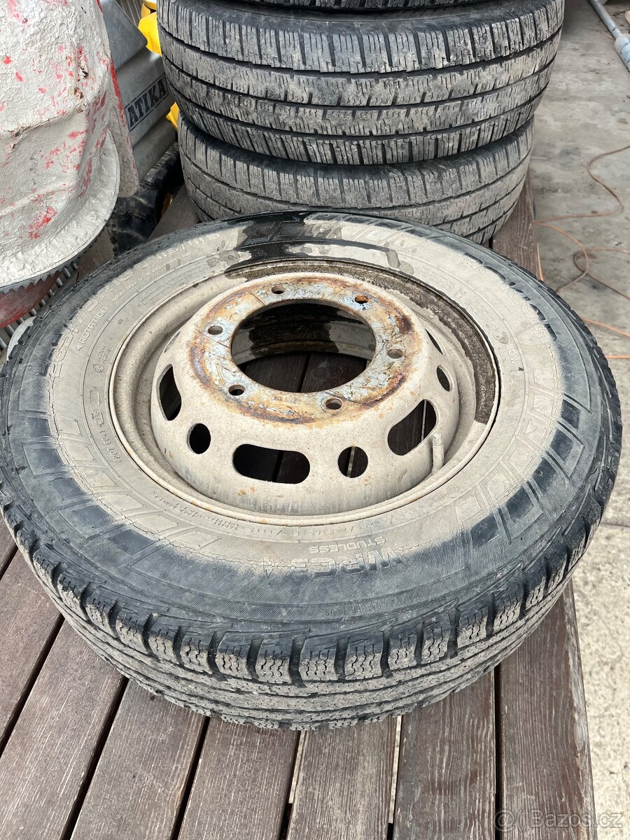 Prodám 6 ks kol disků na Sprintera, tupláky, 5,5 x 16. Jsou na nich pneu 205/75/16c zimní na dojetí dot 2016, pneu špatné, disky jsou v pořádku.