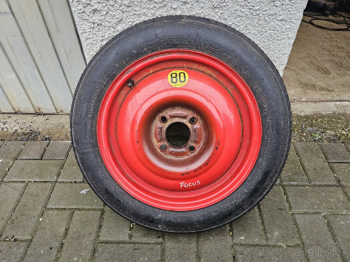 Prodám dojezdové kolo 125/80 R15 vhodné např. pro Ford Focus rozteč 4x108 4J R15 ET40 95M. Pneu Michelin Tex.