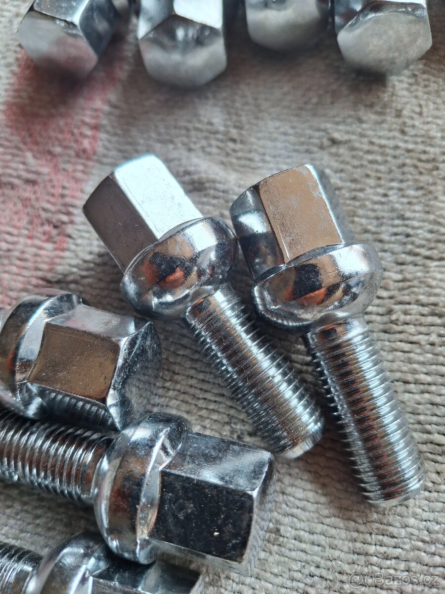 Nabizim kolove srouby chromovane, M12x1,5mm,delka 35mm, 20ks; 5ks nikdy nenamontovane, zbytek na zkousku - mne na auto nepasuji.