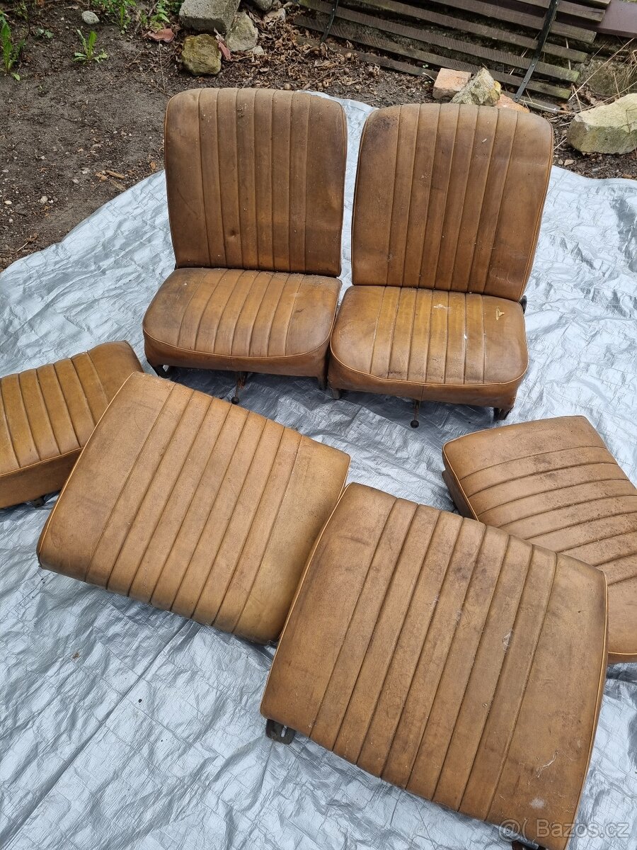 kožené sedačky z vozidla Škoda 1000 MB. Nejsou čištěny a jedna sedačka má menší prasklinku.
