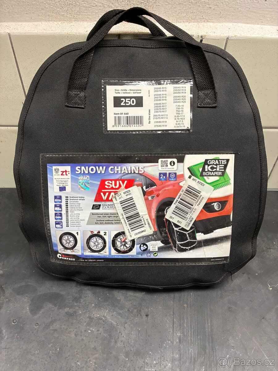 Prodám sněhové řetězy Compass velikost 250, nikdy nepoužité, vhodné na pneu dle tabulky v inzerátu.