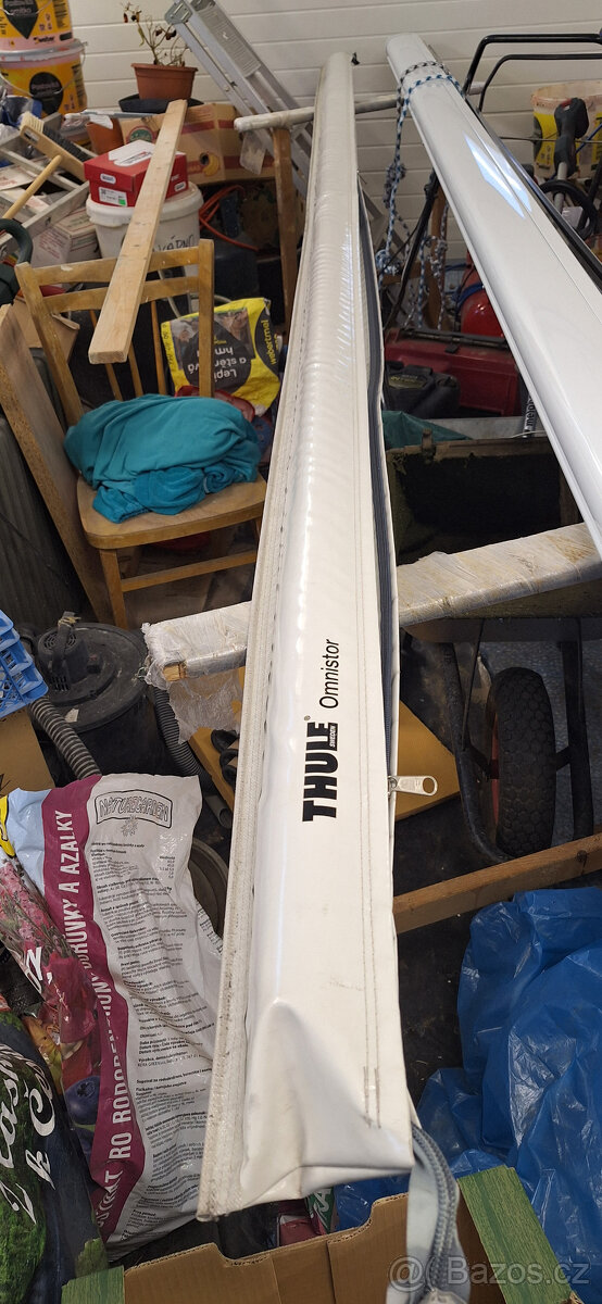Sáčková markýza Thule , 4 m x 2,5 m, šedé plátno. Pěkný stav.