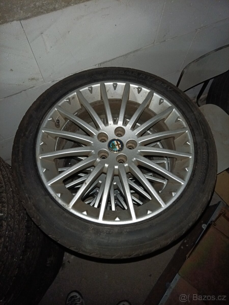 Prodám originál alu kola na Alfa Romeo a letními pneu o rozměrech 225/45 R17, 7Jx17 H2 a 1 sezónu jete zimní pneu o rozměrech 225/45 R17