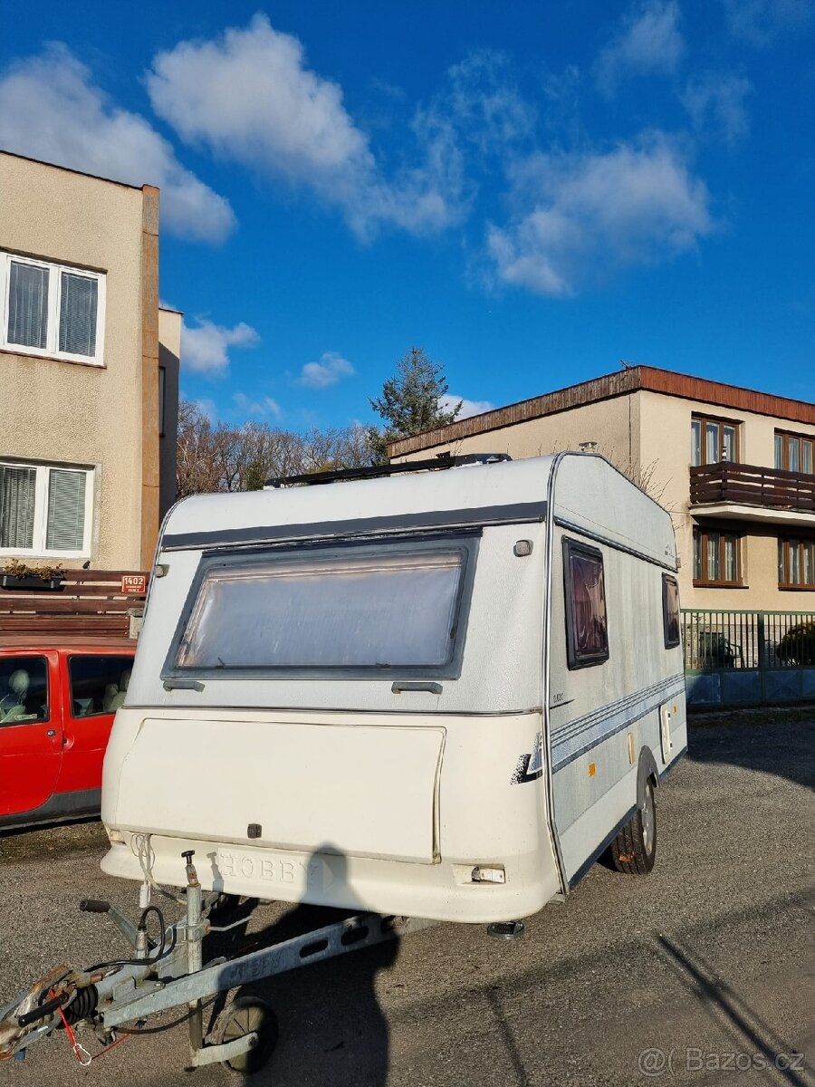 Prodám karavan hobby, vybavení lednice, plynové topení, záchod s koupelnou solár, rozvod vody a elektřiny