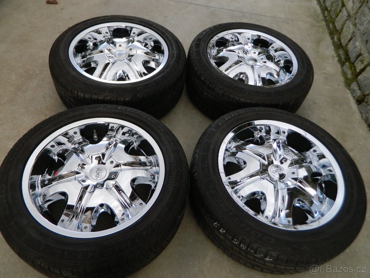 prodam alu kola Status Alloy wheels,9x20,et15,rozteč dvojí 5x120 a 5x127 střed 78mm,vysoká zátěž 980kg,stav velmi pěkný,rovné,Chrom 9 z 10 jak z venku tak zevnitř,po krajích trošku oparkované,obuté do letních 265/50 r20 111V Continental Crosscontact UHP,dezen 6-7mm,pěkný stav ,nepopraskané,nezpuchřelé ale starší dot,nově vyváženo,původní cena jen alu kola 2300liber,jedná se o luxusní kola u nás v čr velmi málo k vidění,pasuji na Range Rover,Land Rover,take BMW X5,X3, nebo také a jiná USA auta,cena za celou sadu 23000