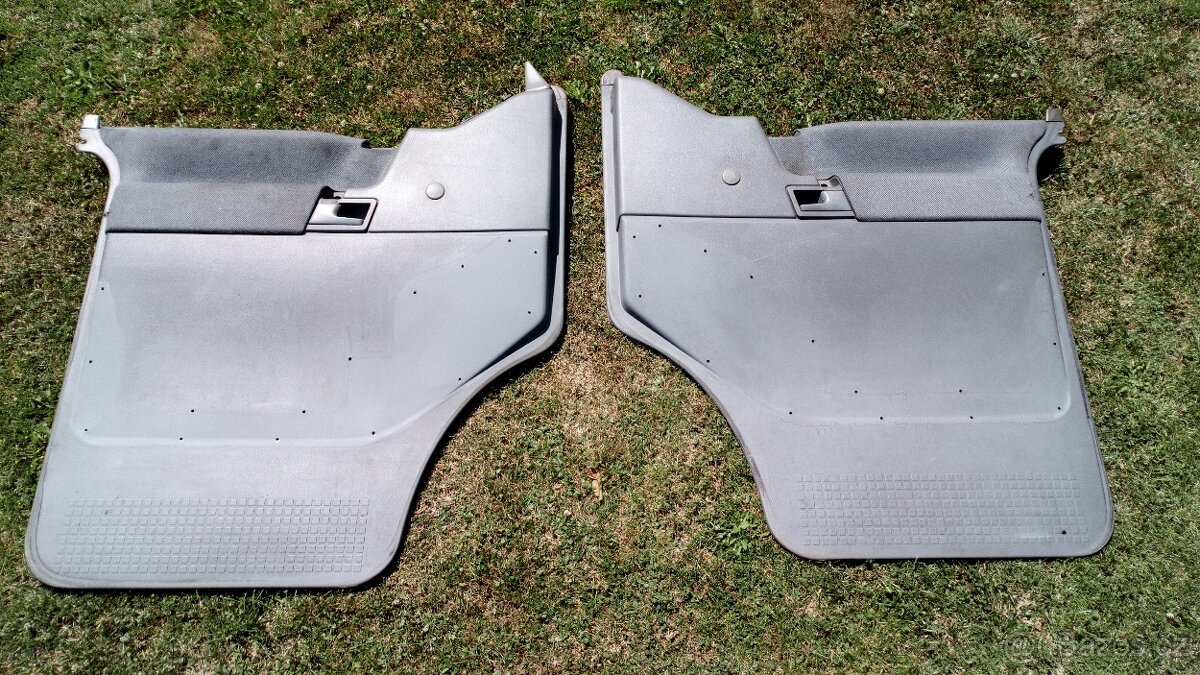 Výplně předních dveří VW T4. Kapsová verze bez kapes. Včetně klik, elektrického ovládání oken a zrcátek. Světle šedé provedení. Levý má ulomený jeden zadní zobáček, pravý dva + malá dírka dole. Stav dle foto, celkově slušné. Více fotek zájemcům do mailu. Pouze osobní převzetí. Cena uvedena za oba kusy dohromady. Již nevyužiji.