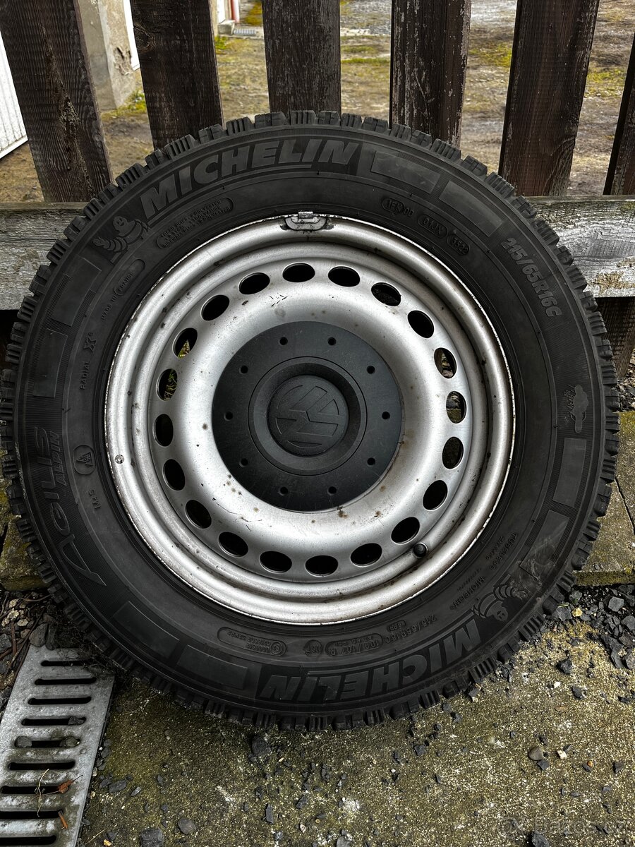 VW T5, T5.1, T6, T6.1, Transporter, Multivan, Caravelle, California, prodám celoroční sadu, 4ks plechové disky, číslo dílu 7H0601027D, rozteč 5x120, rozměr 6,5Jx16H2, ET 51, středová díra 65,1mm, obuto na celoroční zátěžové pneumatiky 215/65 R16C 109/107T M+S 3PMSF (hora s vločkou) Michelin Agilis CrossClimate, dot 22 viz foto. Prodej včetně originálních pokliček.