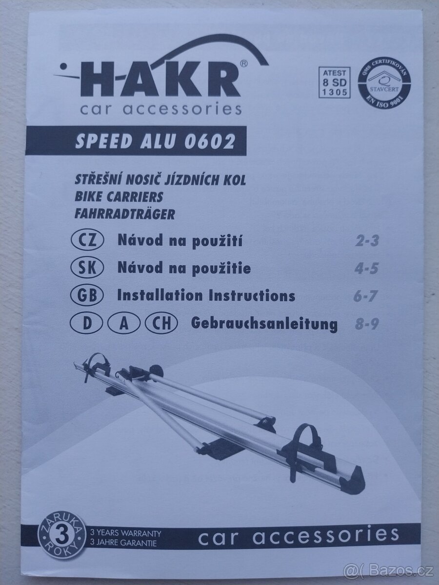 Prodám 2 kusy zamykací nosiče jízdních kol, zn. HAKR, ALU, montáž na střechu automobilu.