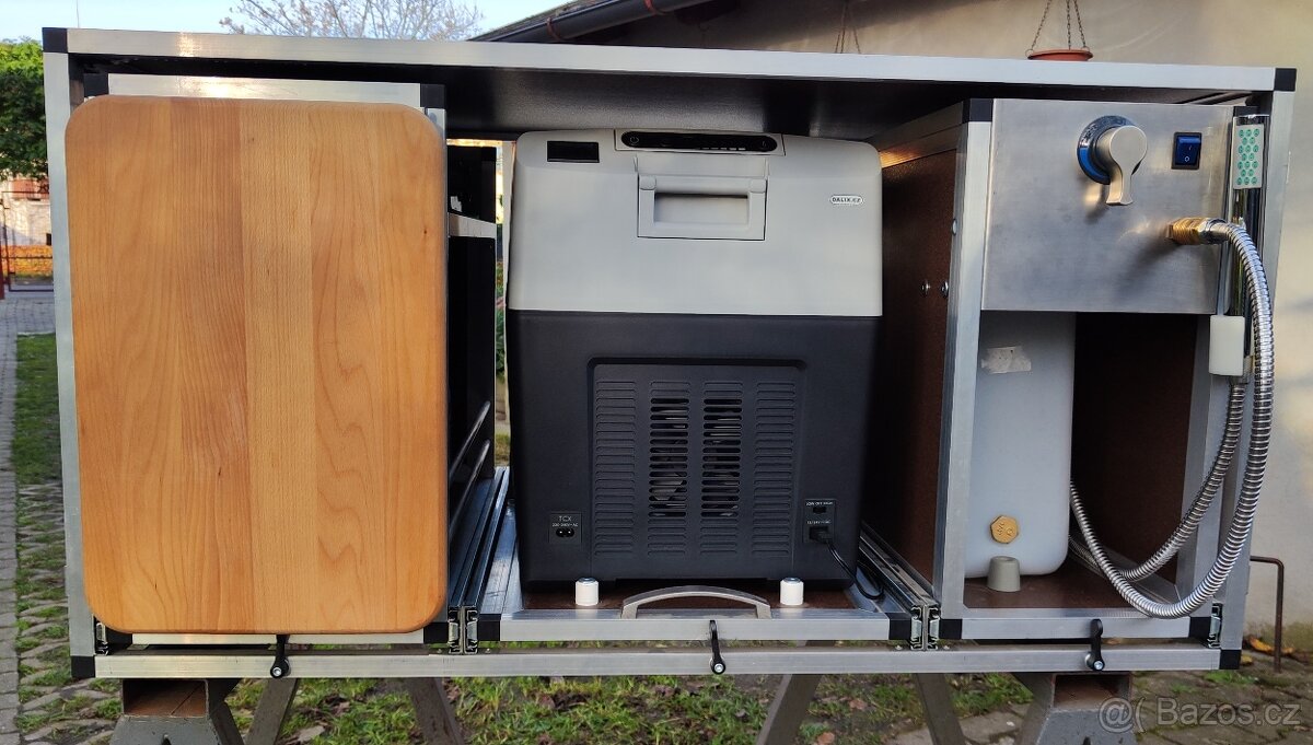Box na pitnou vodu: je vybavený 2 kanystry o objemu 2x14 litrů a 12V čerpadlem, baterií se sprchou