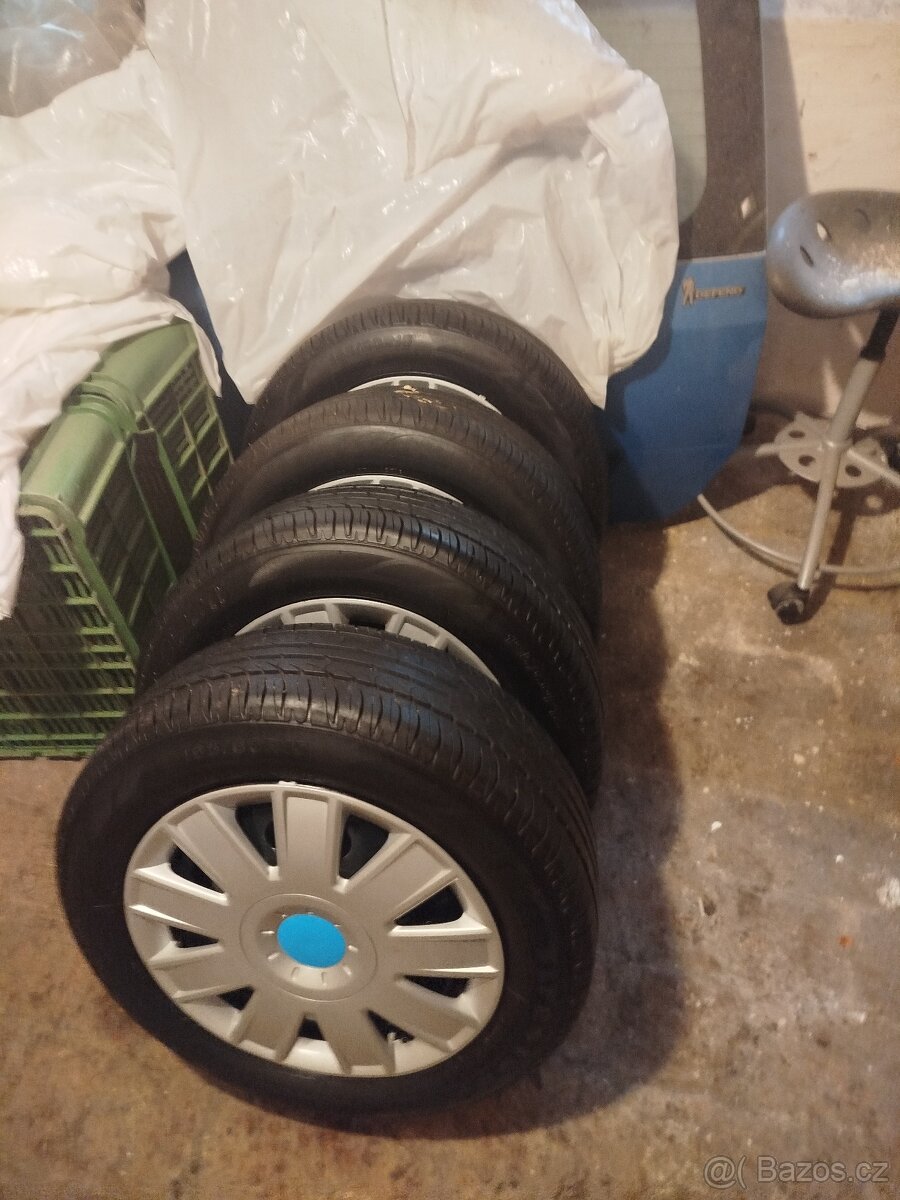 Prodám letní sadu pneumatik Firestone ,obuté na plechových ráfkách. Rozměr pneumatik 195/60/15. Hloubka desénu 5 až 6 mm. K tomu jsou i originál puklice od Fordu.
