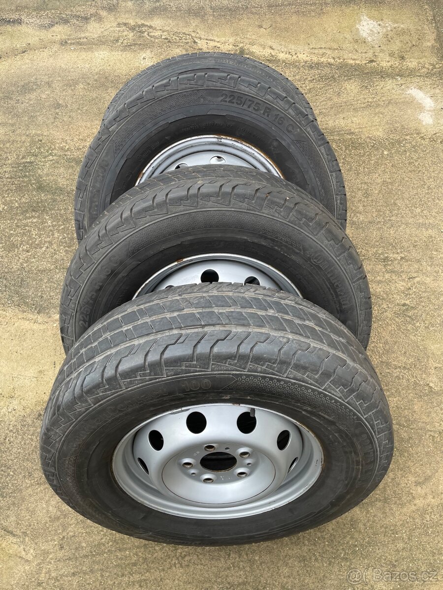 Sada originál plechových disků 5x130 6J 16” ET68. Obuté letní pneumatiky Continental ContiVanContact 100 225/75/16C 121/120R se vzorky 2x8mm a 2x5mm. Disky jsou pěkné, zachovalé, bez koroze. Pneu v pořádku. Cena za komplet. Doprava dohodou.