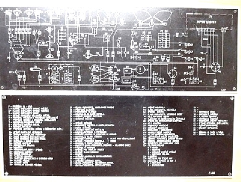 1) nepoužitý hliníkový štítek zapojení elektroinstalace Tatra 815 (č.87), rozměr 10,5x29,5 cm.