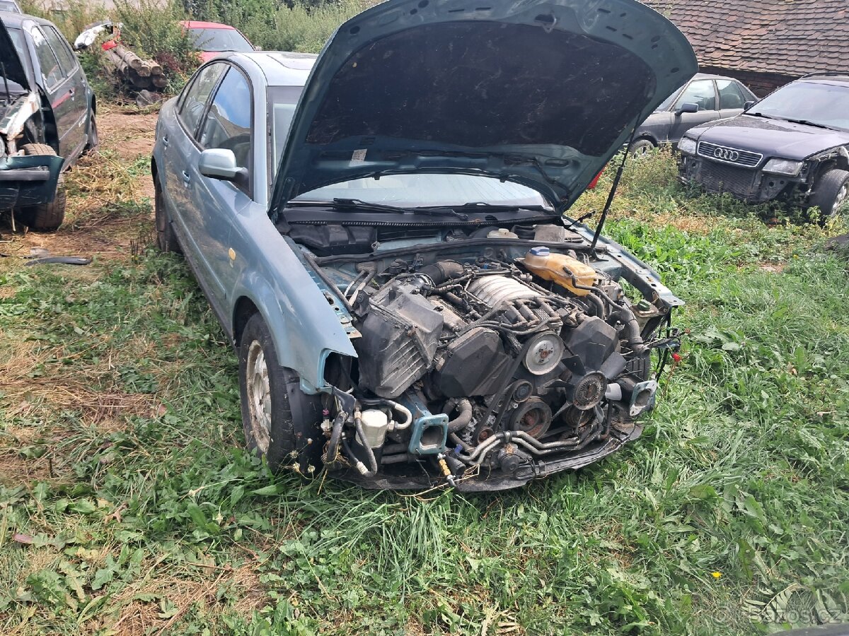 Passat s motorem APR, automat, syncro, potřeboval jsem předek a pár drobností, katalyzátory nejsou. Motor startuje a auto dokáže popojet, ale chybí chladič, někde vzadu teče benzín a nefungují brzdy.