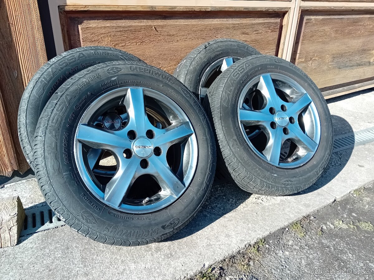 Prodám ALU kola ŠKODA FABIA I. zn.DEZENT,letní pne zn. LASSA 165/70-14,ET-32mm,rozteč 5x100mm,vzorek cca 5-6mm,cena za komplet