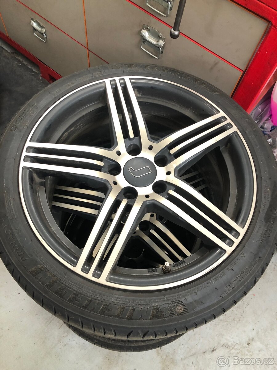 Prodám kola Rondel 5x112 ,jedno kolo odřené,na letních gumách Michelin 225/45 R 18 jednu sezónu jeté,vzorek 6 mm DOT 2822 + podložky 2 ks na zadní nápravu tloušťka 1,5 cm+ šrouby