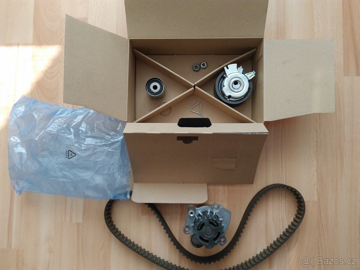 Prodám použitou originální sadu rozvodů (řemen-Dayco, napínací kladka-Litens Canada, vodící kladka-INA France, vodní pumpa, příslušenství), preventivní výměna po 120tkm. Kladky v pořádku, vodní pumpa neteče. Jedná se vše o originální díly VW,audi,škoda. Řemen-Dayco, malá kladka-INA France, napínací kladka Litens Canada.
