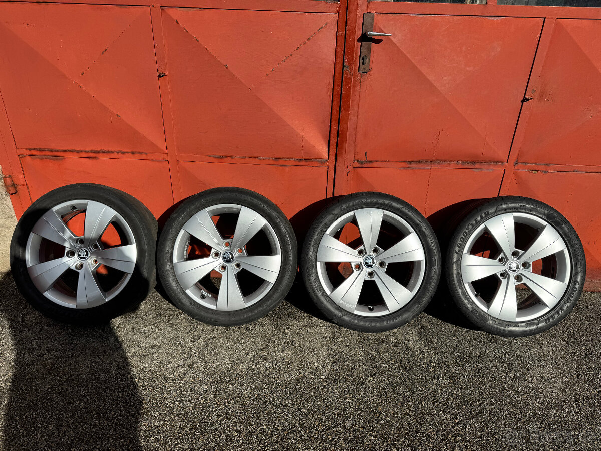 Prodám originální alu kola škoda. Byli na škoda octavii III. Pneu Goodyear kupované loni na jaře, disky rok předtím. Nyní nové středové pukličky. Dva disky mají místama odřeniny zbylé dva jsou ve slušném stavu. Kola jsou čistá, rovná nyní nově vyvážená.
