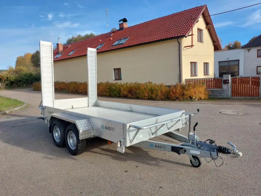 CELOHLINÍKOVÝ přepravník stavební mechanizace s nízkou ložnou plochou. Provozní hmotnost pouze 690kg, užitečné zatížení 2810kg. Unikátní monolitický Alu svařenec vyznačující se vysokou pevností při co nejnižší provozní váze. Ideálním řešením pro přepravu minijeřábu, minibagrů, UNC smykových nakladačů a jiné stavební mechanizace. Robustní a vysoce odolný celosvařovaný hliníkový rám včetně podlahy a bočnic, Alu tandemové nášlapné blatníky, na oji Alu podpěra pro lžíci bagru, 2x zadní výklopné a stranově posuvné ALU nájezdy s podpěrou, vhodné i pro pojezd vibračních válců, délka nájezdů 2110 mm, šířka 350 mm, zesílené značkové brzděné nápravy KNOTT 2 x 1800 kg , profi litinová nájezdová brzda s výkonnou couvací automatikou, zakládací klíny včetně držák, kompletní LED osvětlení.