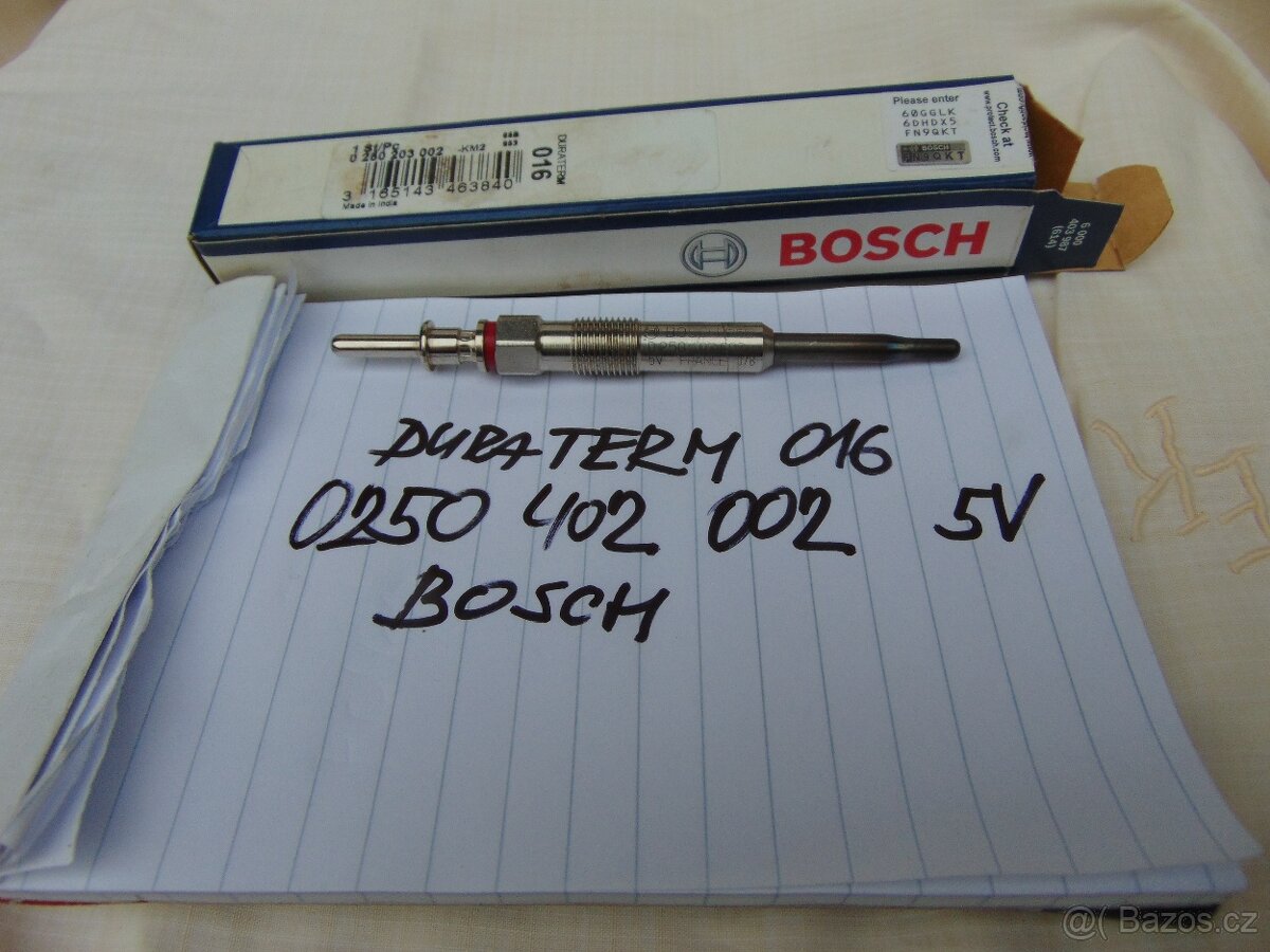 Žhavicí svíčka BOSCH 0 250 402 002, DURATHERM 016, 5V. Provedení žhavicí svíčky: drátová žhavicí svíčka Napětí [V]: 5V Délka [mm]: 106mm Velikost závitu: M 10 x 1 Stoupání kužele: 63 Rozměr klíče: 10 Utahovací moment od [Nm]: 0Nm Utahovací moment do [Nm]: 15Nm Spojovací technika: PIN armatura [mm]: 32mm.o.e 12 23 7 786 869,