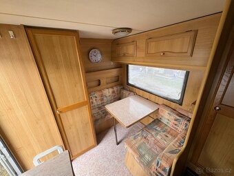 Rozložení: V pření části (tj. nad ojí) se nachází dvoulůžko rozložitelné na sezení. V prostřední části se nachází kuchyňka s lednicí a mrazákem (12V, 220V, plyn), plynovým sporákem, digestoří a dřezem. Naproti kuchyňce se nachází skříň na oblečení, pod kterou je umístěné plynové topení s elektrickým rozfukem. V zadní části, naproti vstupu, se nachází druhé sezení, které lze rozložit na podélné spaní pro 1 dospělou osobu, nebo 2 děti. Vlevo od vstupu se nachází koupelna s kazetovým WC, umyvadlem a vaničkou pro sprchu.