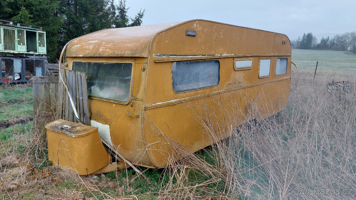 karavan na dvouosém podvozku,v případě použití nástavby jsou potřebné opravy,ale do karavanu nezatéká,podlahy v pořádku, nebo využít pouze podvozek,bez TP / chata přívěs vlek podvalník autopřepravník/