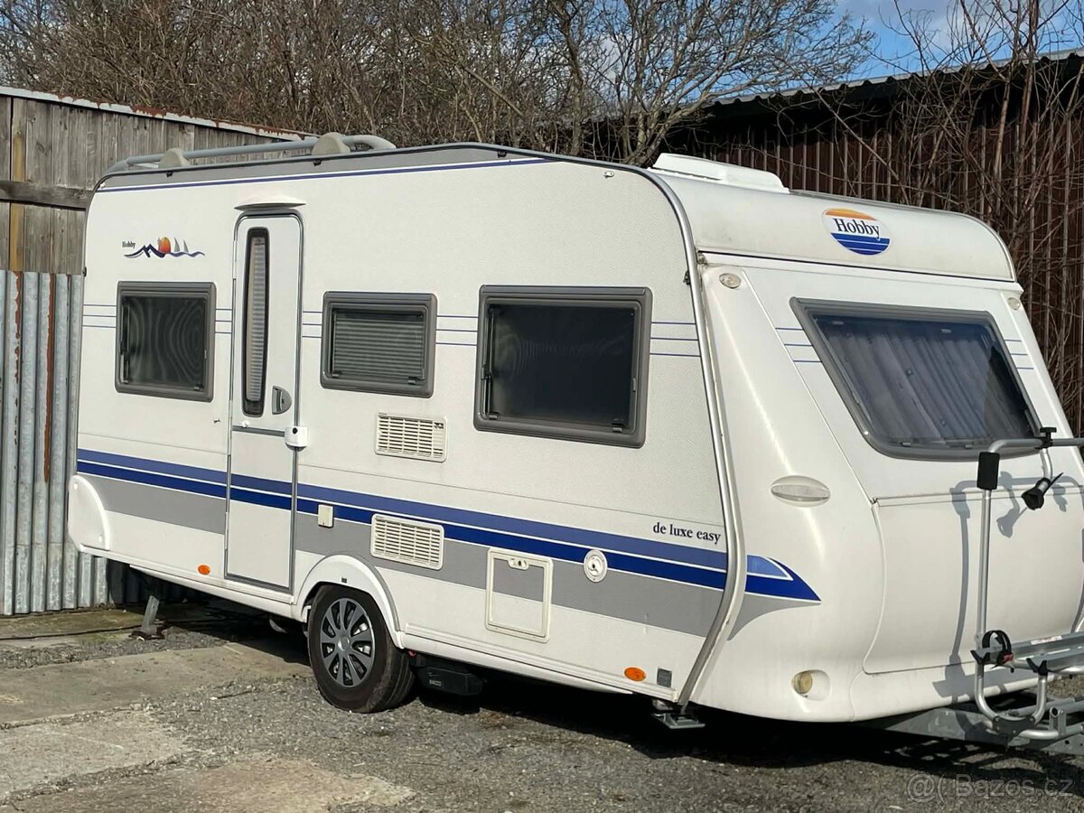 Prodám krásný suchý nezatečený karavan HOBBY 450 DE LUXE včetně předstanu, rok 2006, nový plně automatický mover v záruce, plynové topení s rozfukem, nádrž na vodu 45L, studená a teplá voda, WC chemické kazeta, umyvadlo, dřez, lednice trojkombinace s mrazákem, baterie 100A + nabíječka, nová matrace, držák na dvě kola, stabilizátor jízdy, rychlost 100 km, celková váha 1200 kg, rozvod elektřiny 12/230 V, koberec do předstanu, externí nádrž na šedou vodu, sítě a rolety, přídavná zrcátka na os. auto