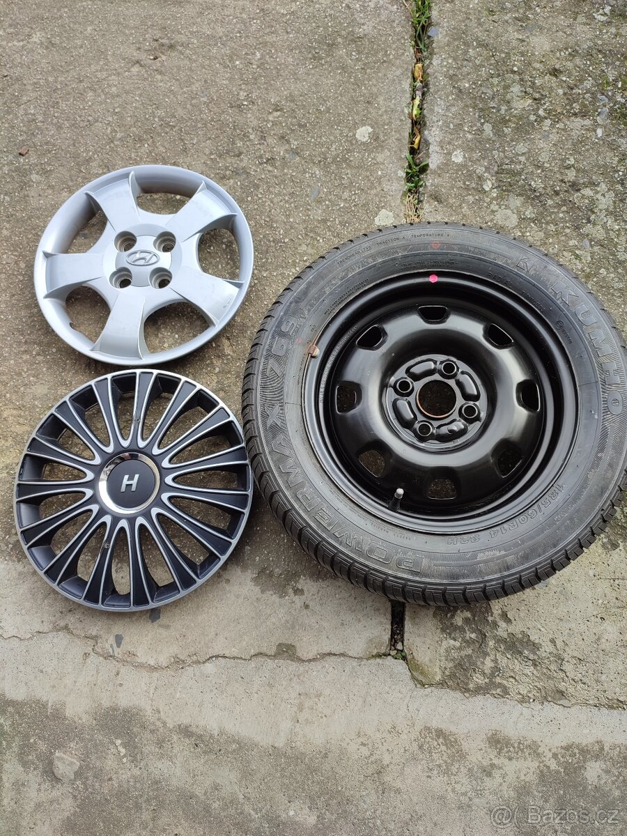 Prodám 4x disky, letní pneu + 8x poklice 185/60 R14 (4 x 100). Kola jsou z Hundaie Akcent. Nové pneu, stáří 2 roky.