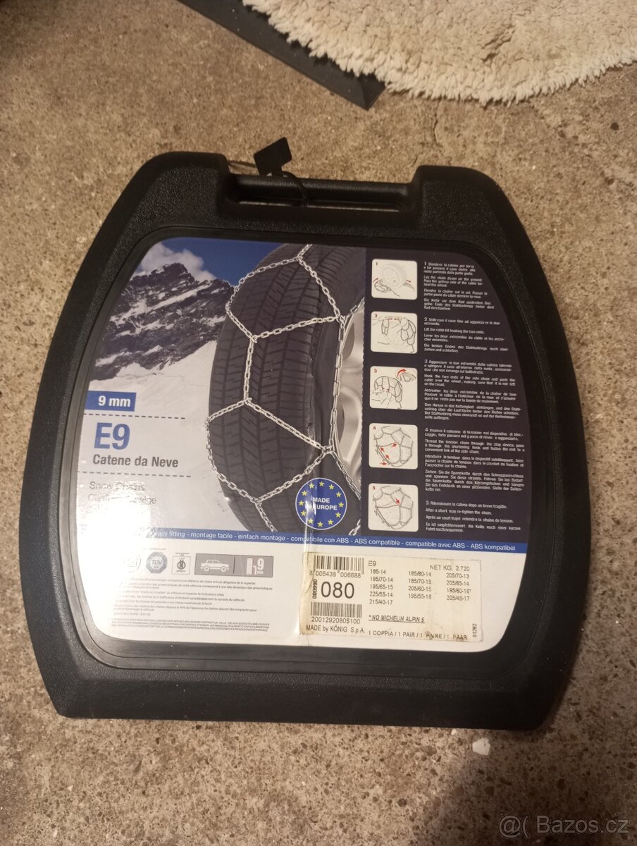 Sněhové řetězy, velikost 080, vhodné na Škoda Scala, dále velikost pneu dle foto. Nepoužité, platí do SMAZÁNÍ!!!
