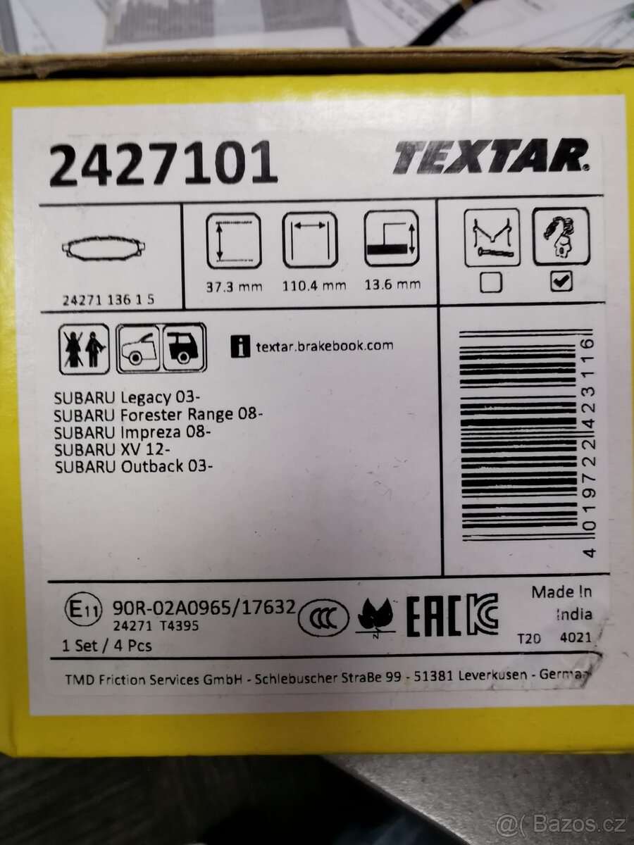 Prodám zadní brzdové destičky TEXTAR na Subaru Impreza, VX, Legacy, Forester, Outback