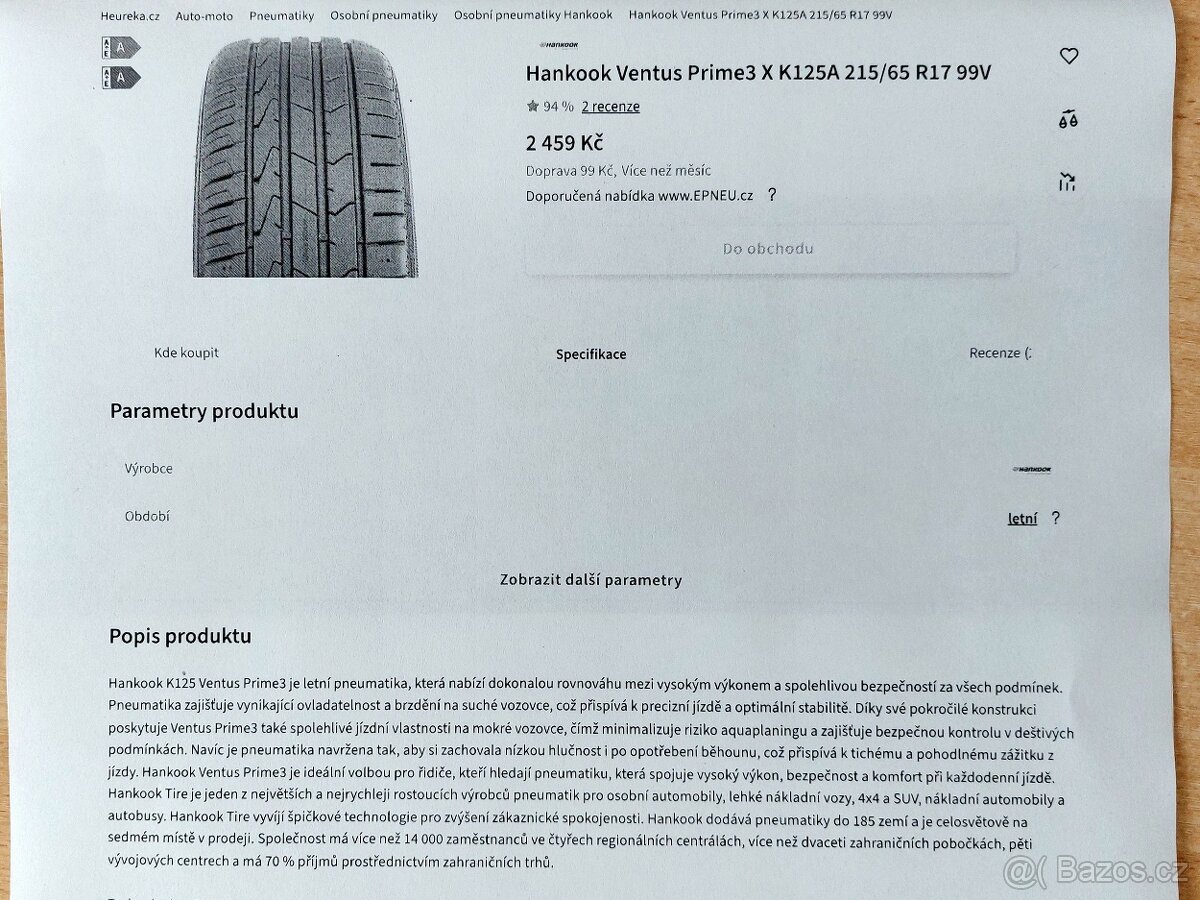 Prodám letní pneu 215/65R17 99V Hankook Ventus Prime 3. sleva 45%.