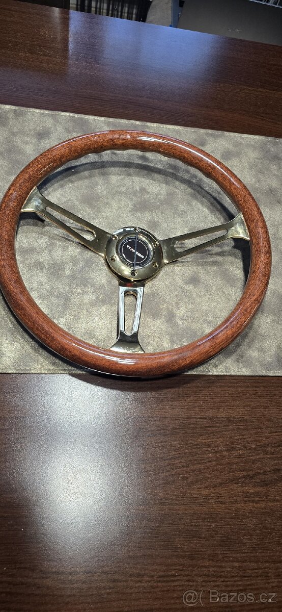 Prodám.dřeveny volant 38cm . Průměr. Lesklý chromovaná. nový
