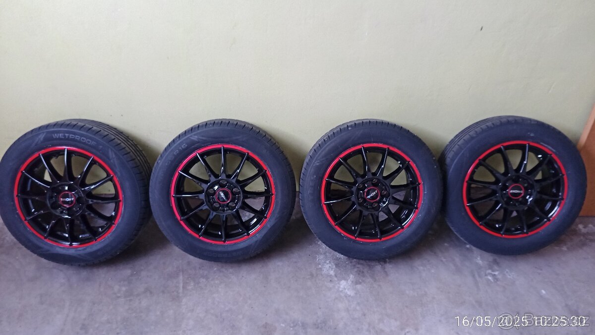 Prodám novou sadu kol Ronal R54 7x16 5x114,3 ET40 jetblack red rim,středová díra 82 s vymezovacím kroužkem 64,1 tedy na Hondu,pneu nové letní Nokian Wetproof1 205/55/R16,kola i pneu jsou nově obutá a vyvážena.