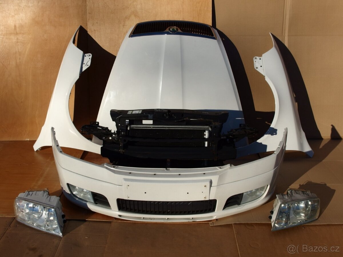 Nabízím kompletní předek Škoda Octavia II. Součástí sady je přední nárazník, výztuha, kompletní chladičová stěna - benzin (chladič AC, vodní chladič, intercooler, ventilátor chladiče), přední světla, kapota, čelní maska a blatníky. Barva bílá. Rok výroby 2008. Cena 29000,-Kč.