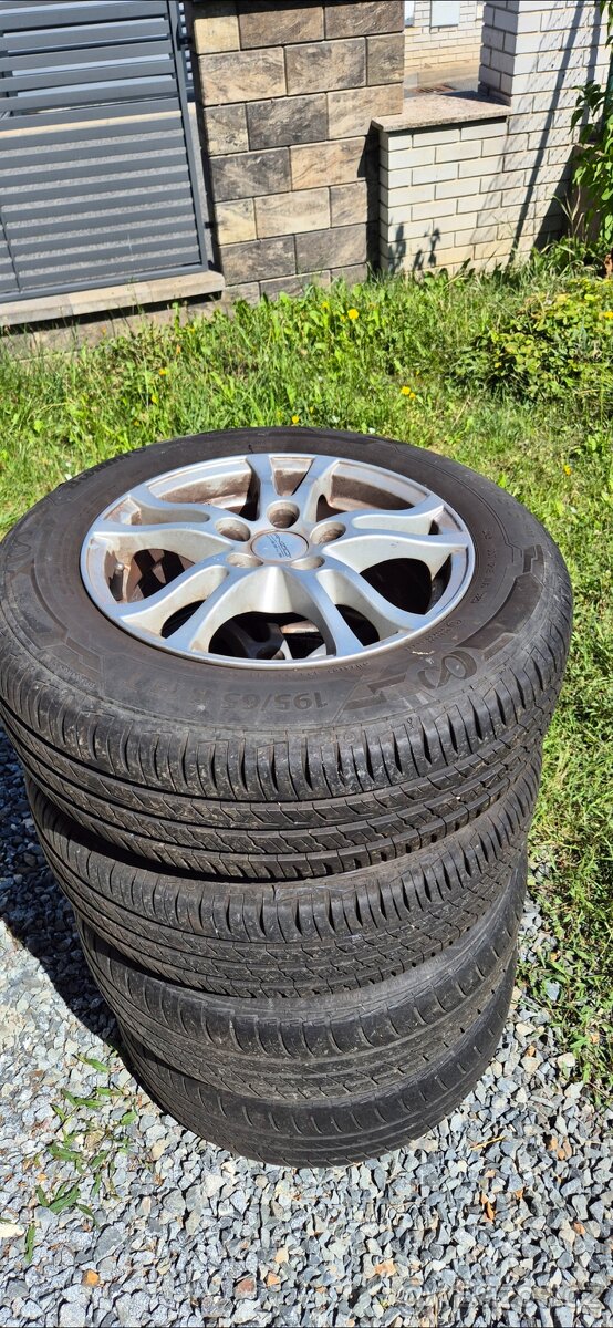 Alu kola 6.5J×15H2,ET 38,rozteč 5×112,z letní pneumatiky BARUM 195/65 R15T.Dvě pneumatiky jsou dobrý a dvě na výměnu.
