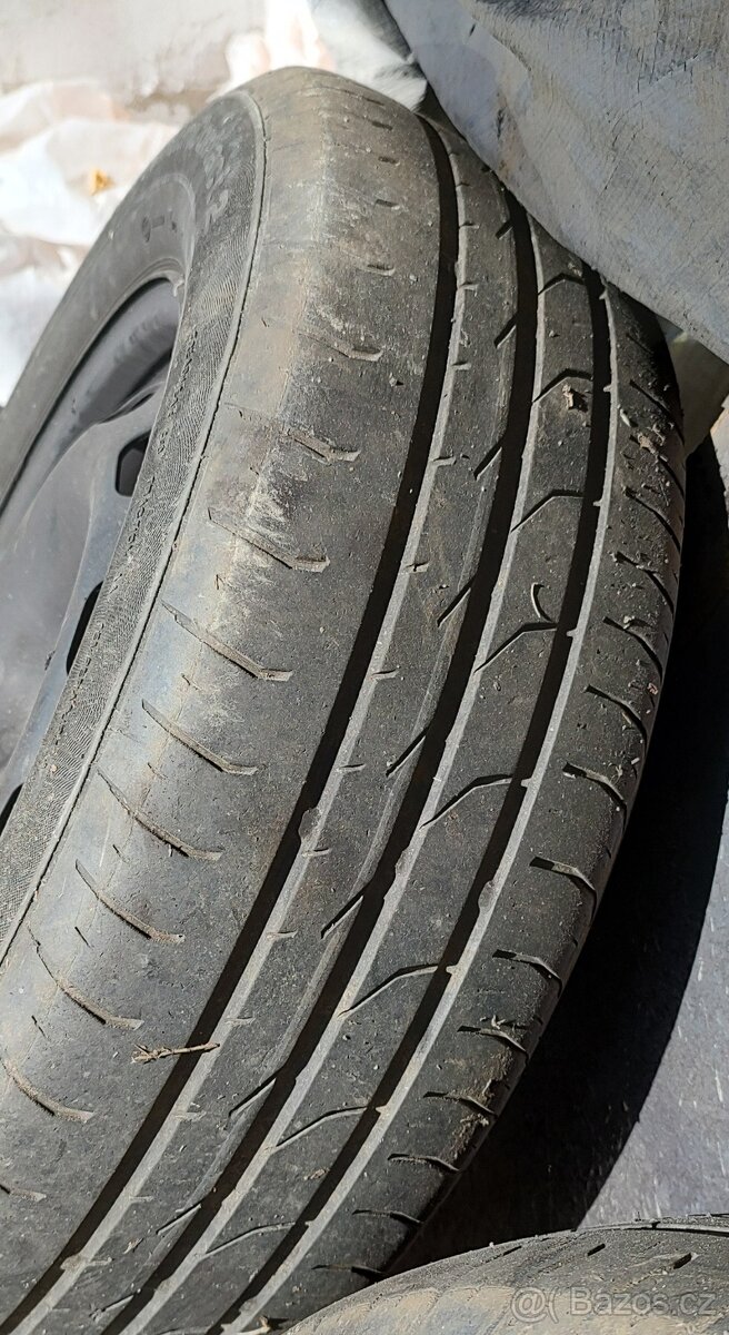 Prodám plechové kompletní disky 5 děr, rozměr ráfku 6J x15H2 ET38 a letní pneumatiky na dojetí vzorek 4,5 mm značky Continental Conti premium Contact2 195/65/R 15 91H .Neuchází.Cena za 4ks.
