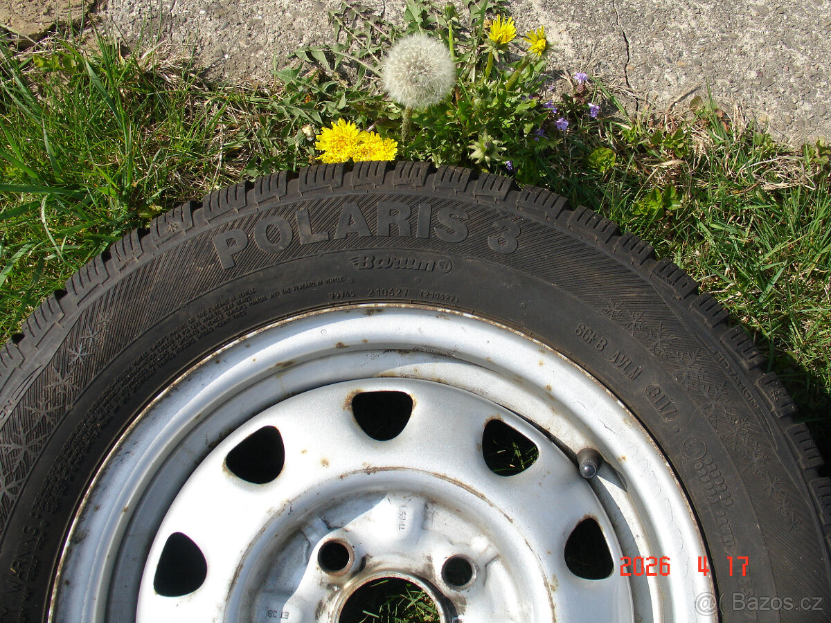 Prodám 2 kusy zimních pneumatik Barum Polaris 3 včetně disku, rozměr 165/70 R13 79T, M+S radial. Pneumatiky jsou ve velmi dobrém stavu (viz foto), rovnoměrně sjeté a bez poškození, vzorek cca 7 mm. Osazeno na plechových ráfcích 4,5J-13H, ET 38, rozteč 100 (Felicia, Favorit). Cena za 2 kusy. Ještě dlouho poslouží. Preferuji osobní odběr, dovoz dle dohody. Platí do smazání.