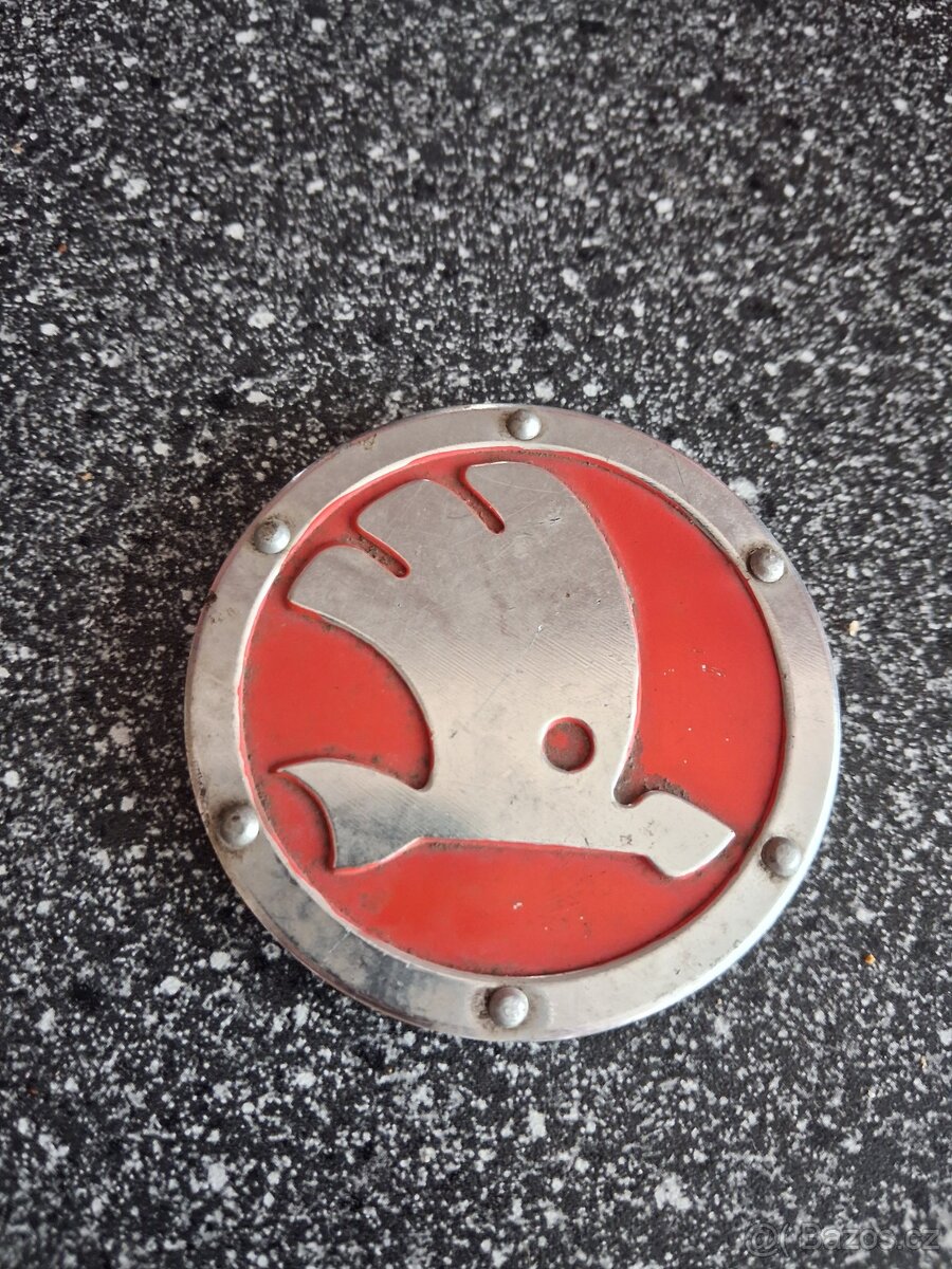 Hliníkový štítek s logem Škoda na zástěrku kola. Štítek je evidentně nepoužitý.