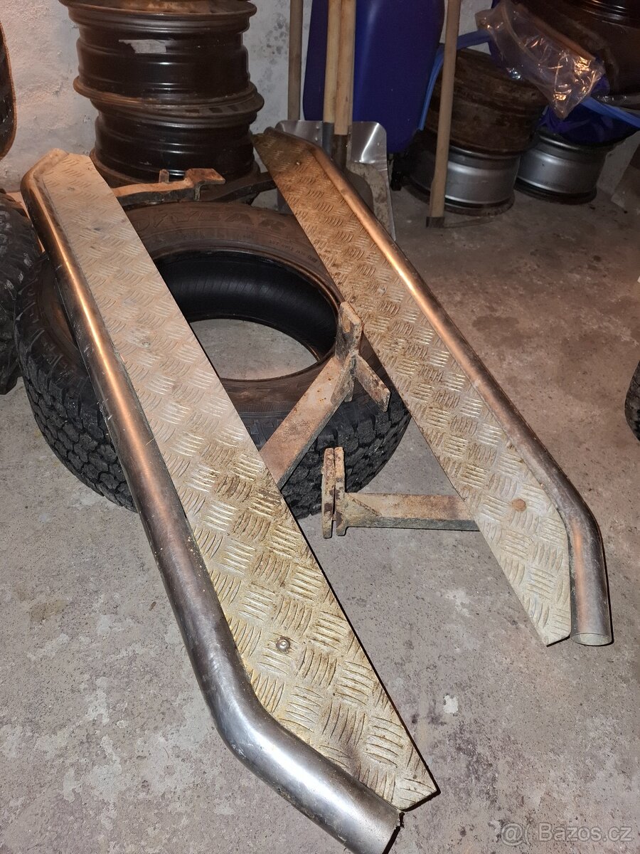 Jeden pár off-roadových nášlapů. Sundán z Mitsubischi Pajero třídveř, univerzální nerezový set. Parádní doplněk na Gumbalkan