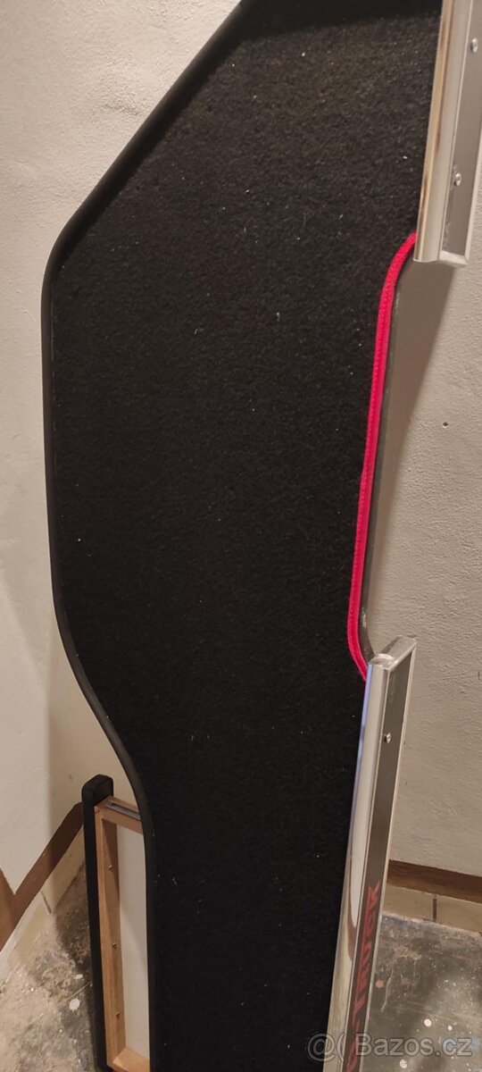 Polička je dřevěná a odkládací plocha je potažená černým kobercem.