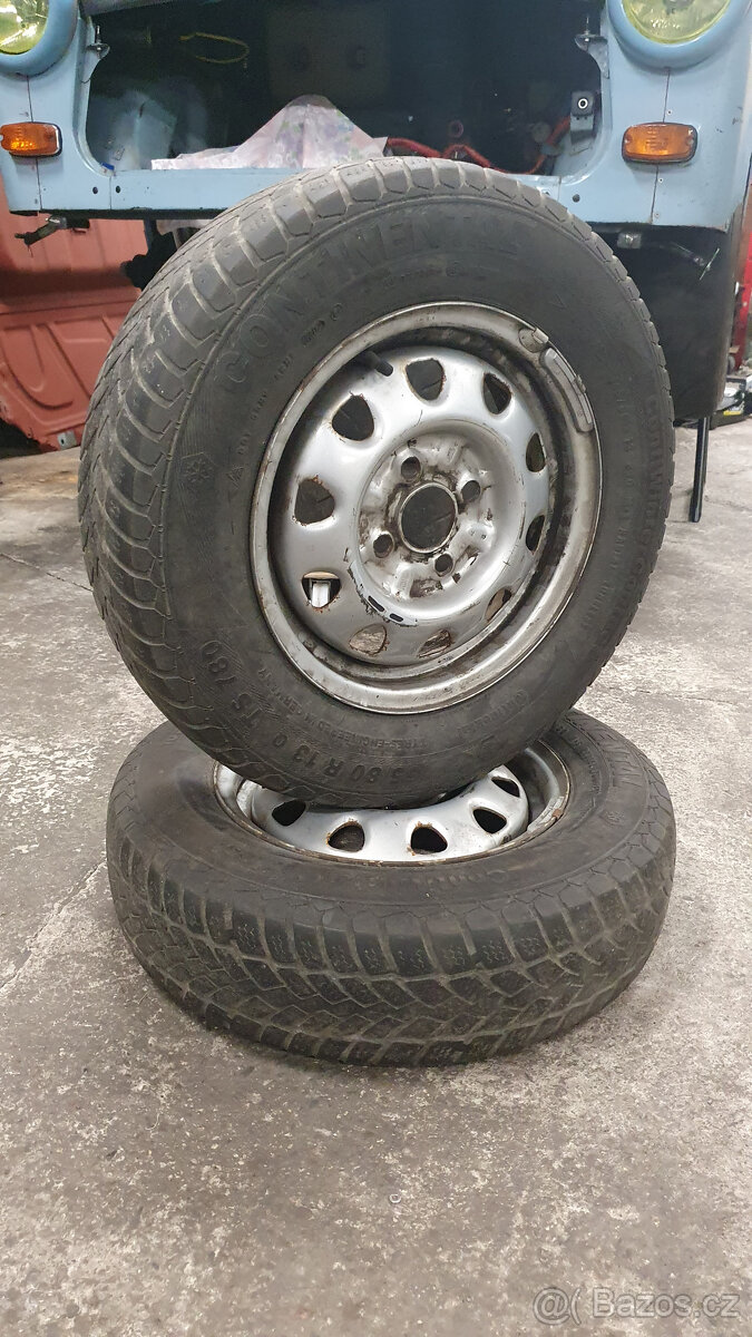 Dva klasický plecháče Felda 13" 4x100 57,1mm. Kopance nejsou. Obuté na úžasných Continentálech 165/80R13, který jsem si ukrutně užil v zimách 2012/2013. Teď jsou z nich totál sjetý gumky, jak smažka z radnice.