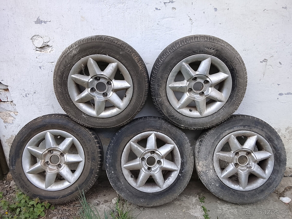 Prodám 5ks obutých kol, disky 5,5J x 13 H2. Rozteč 100mm, Felicia.