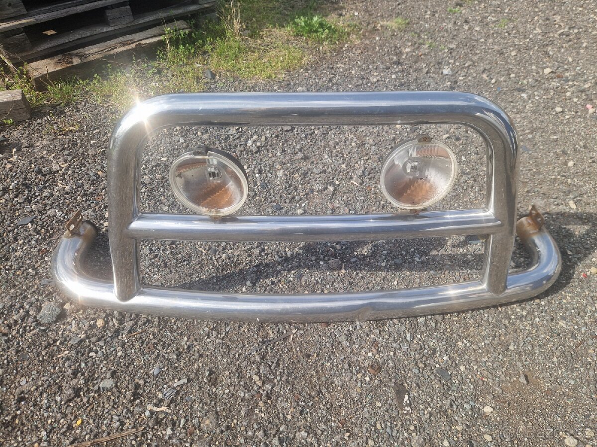 Přední ochranný rám Ford Transit r.v. 2000 - [10.4. 2026]Přední ochranný rám na Transita, přídavná dálková světla. Dva drobné ťukance. Projde STK, nepřekračuje o více než 15cm, našel bych i homologační štítek. Značková tovární výroba CZ, není domácí výroba.