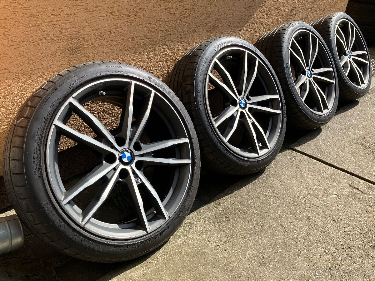 Prodám originální 19” alu kola z BMW řady 3 (G20). Kola jsou v hezkém stavu. Pouze na zadních kolech je lehká oxidace (viz. foto). Na kolech jsou obuty letní pneumatiky Tomket Sport o rozměru 225/40 ZR19 93Y a 255/35 ZR19 96W. Všechny čtyři pneumatiky mají hloubku vzorku 5,5mm a DOT1822. Na kolech jsou také čidla tlaku v pneumatikách!
