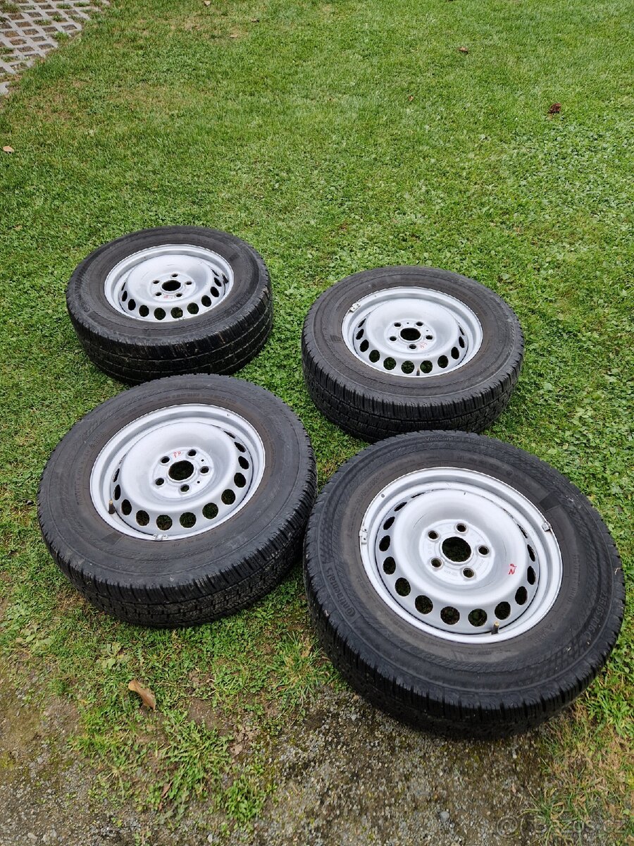 Prodám celoroční pneu i s diskama, bez poškození bez rezu. Pneu Continental van contackt 4sison 235x65 R16C originální VW