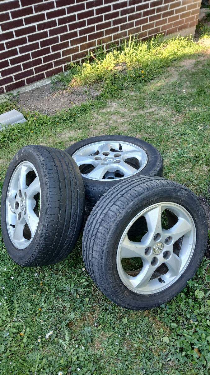 Prodám jetá letní pneu z Mazdy 195/55R15 Bridgestone s ojetými aludisky. Jen osobní odběr.