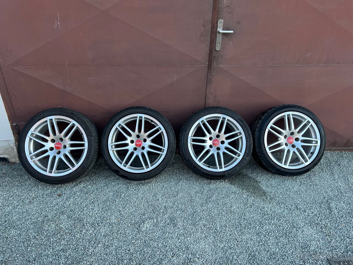 Originální alu kola Audi A5 5x112 R19 - [23.4. 2026]Prodám originální alu disky z Audi A5 včetně středových pokliček a letních pneumatik Continental SportContact 6 s hloubkou dezénu 2x5mm, 2x4mm