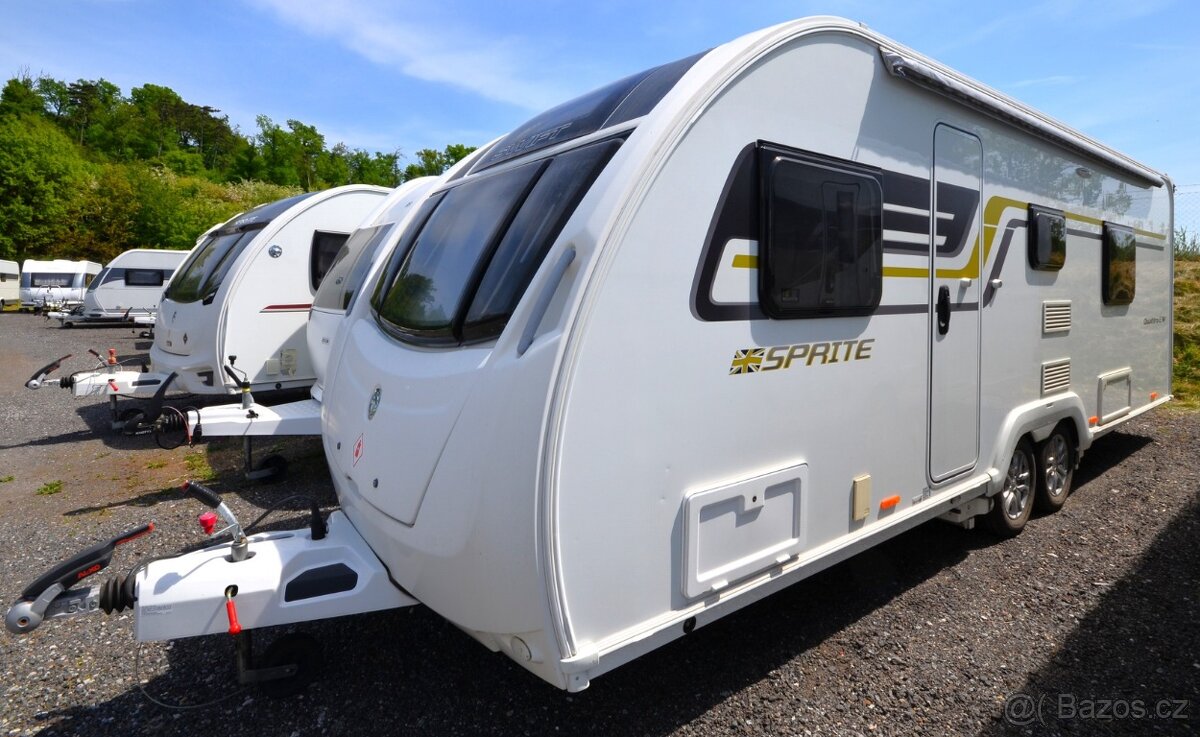 Obytný přívěs Swift Sprite Quattro EW, datum první registrace 2019, 6 lůžek, celková délka 7 920 mm, celková šířka 2 230 mm, provozní hmotnost 1 404 kg, nejvyšší technicky přípustná hmotnost 1 800 kg.