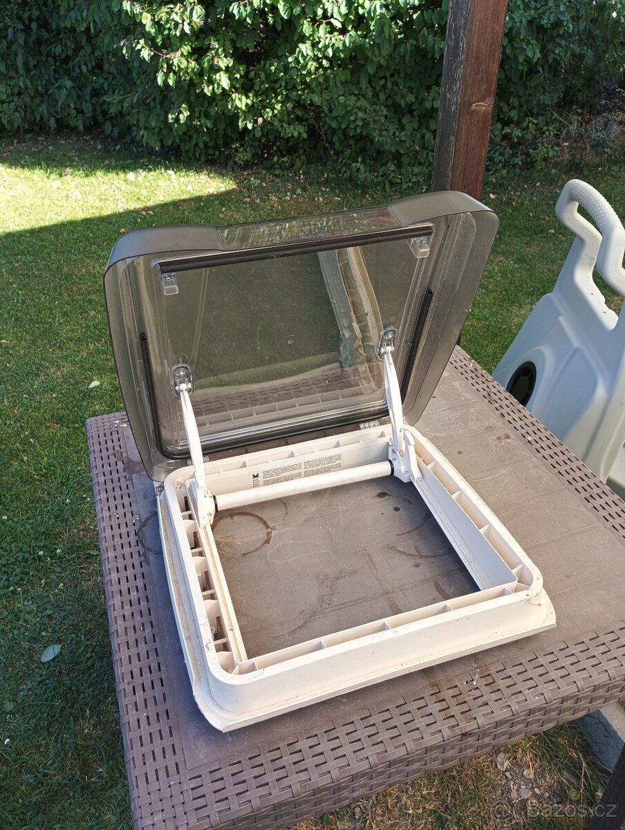 Nabízíme k prodeji použité výklopné střešní okno do karavanu nebo obytného auta pro výřez 40*40cm, včetně rolety na noc a sítě proti hmyzu.