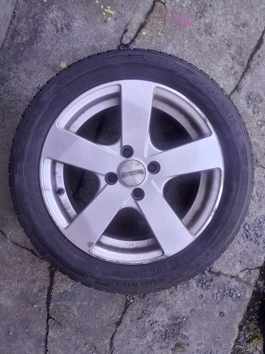Prodám kola značky dezent 4x100 R15 středová díra 57.1mm, na discích obuto pneu 185/55 R15 zimní Barum polaris 5, vzorek 5mm